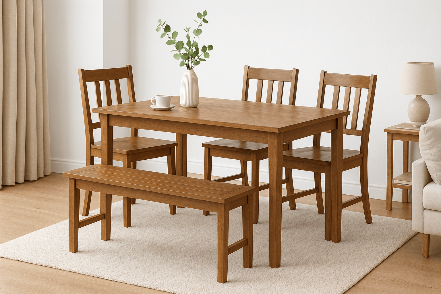 Includes Table, Bench and Chairs in Natural Brown Finish
