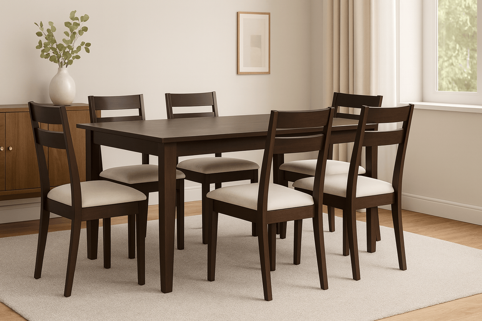 This 7-piece dining set includes one rectangular table and six matching chairs, crafted from solid rubberwood with a dark finish. The chairs feature padded seats for everyday dining comfort. Designed to suit a range of dining spaces, from family meals to casual gatherings.